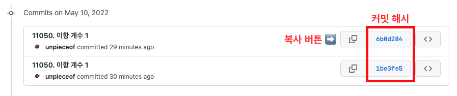Merge ํ๊ณ ์ถ์ ์ปค๋ฐ์ ํด์๋ฅผ ๋ณต์ฌํ๋ค. ์ปค๋ฐ ํด์๋ ๋ณดํต ์ปค๋ฐ ๋ด์ญ์์ ์ฝ๊ฒ ํ์ธ ๊ฐ๋ฅํ๋ฉฐ, Github ์์๋ ๋ค์๊ณผ ๊ฐ๋ค.